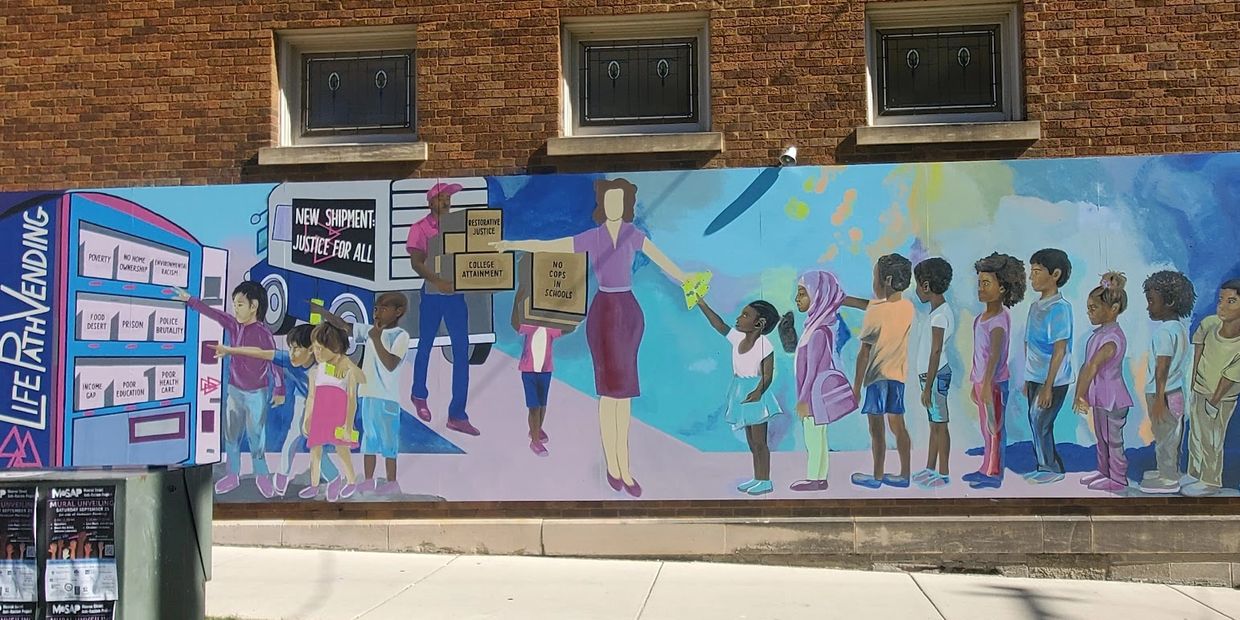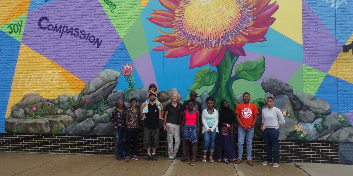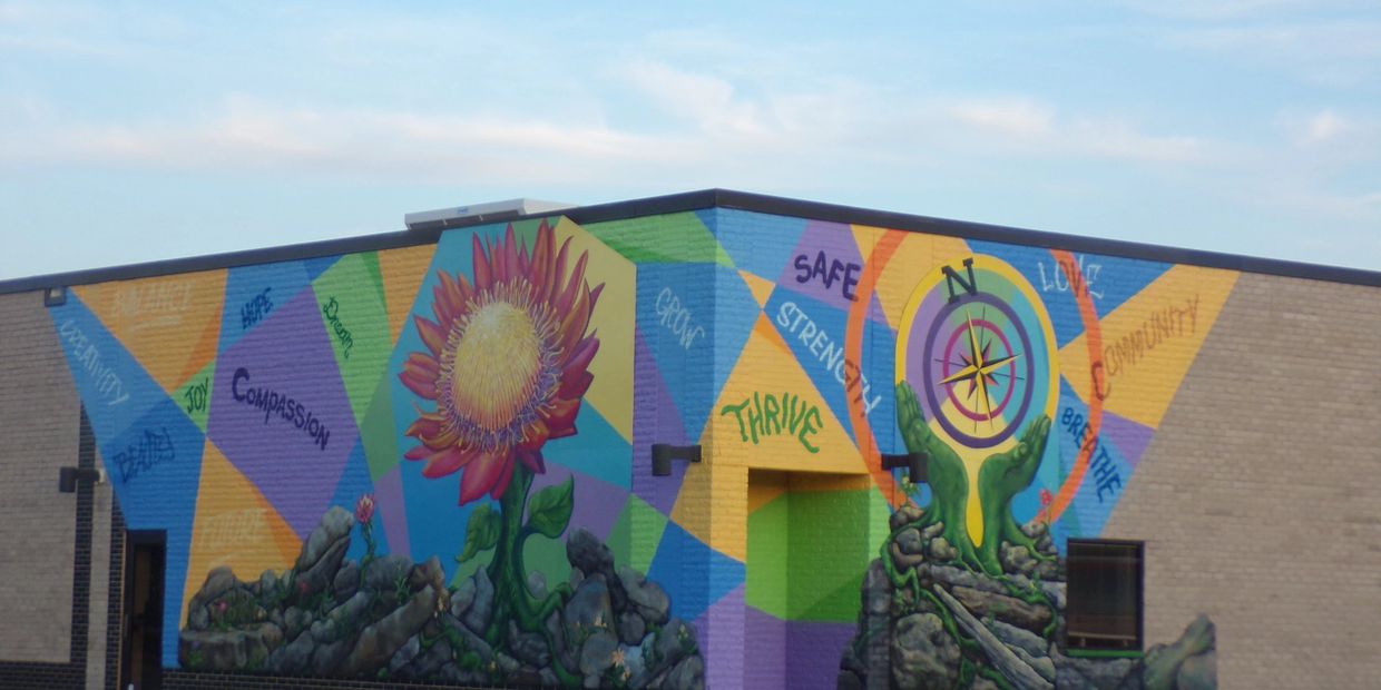 Mural on the side of the Dane County Job Center. Dane Arts Mural Arts. Collaborative project with lead artists and students. 2019.