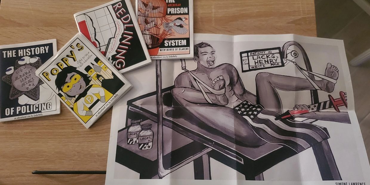 The zines tell a story in their own right as follows: (1) The system of police brutality demands community control - the photographs that make up the core of the background (credit to Kenechi Unachukwu) force a deeper look into the emotions, the anger behind the downtown Madison protests for George Floyd’s unconscionable death. What if the concept of defunding the police was as obvious as the extinction of “slave catchers?” (2) What if the overt obstinance and resistance against Jim Crow laws were more palatable during that time? What if the fight for educational equality was more overt to this day in the state ranked worse for Black students’ education? (3) On that same vein, redlining and gentrification as we see them today has caused an exponential generational wealth gap amongst Black Americans. What message would be received from our radical resistance to defund the capital and refund the people, and how might that impact our ability to function as a collective? (4) Criminalizing and funding prison systems continues to hold our Black and Brown people hostage. What if call-out culture could be used to defund the 1% and abolish prisons? (5) To this day, skepticism floods the Black community as it relates to our medical and mental health systems. As a result of years of unethical practices swept under the rug, what if white men were stripped of their American dignity with one plunge of a syringe?