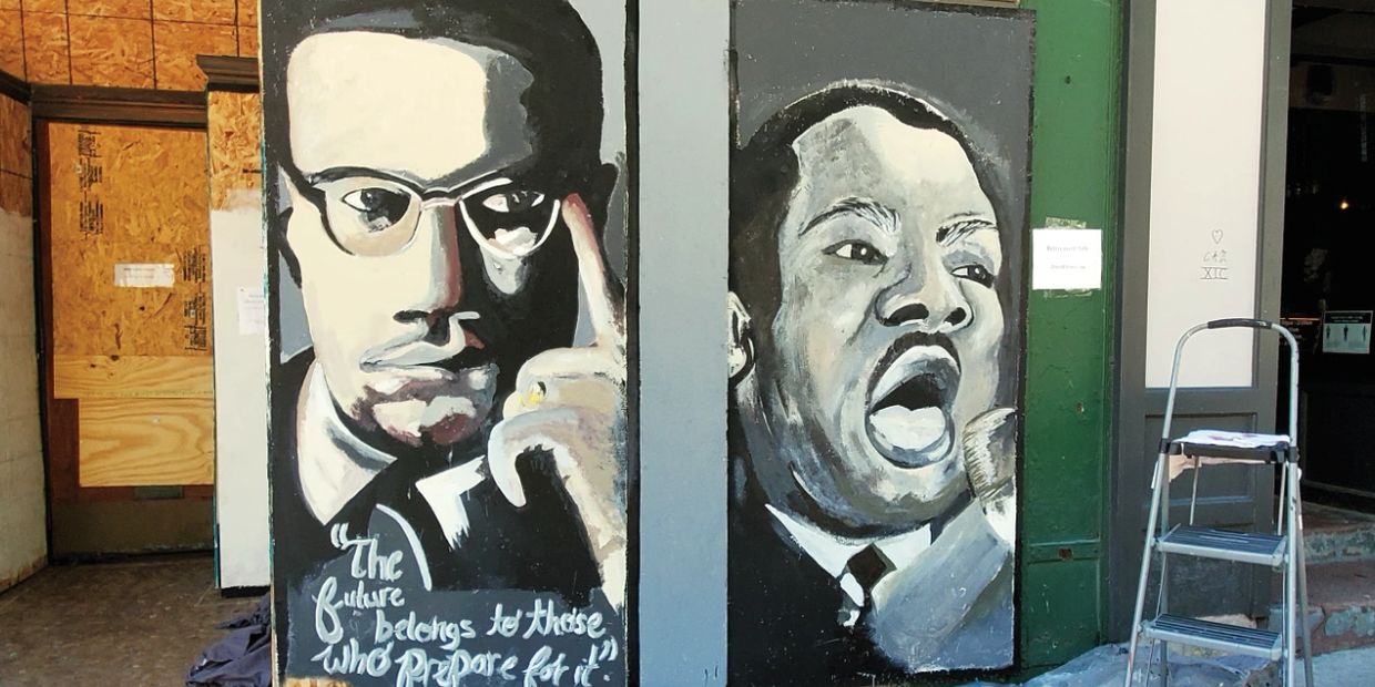 With this thought at my forefront, I created a mural initially designed with three leaders of change in mind — Colin Kaepernick, Martin Luther King, Jr., and Malcolm X. All three leaders had the courage to take a stance for justice in their own right and in their own way. Resistance comes in all flavors. As people set their eyes on my piece, I want them to imagine new ways to fight the system as we continue to take inspiration and strength from our past. What methods of resistance have we yet to explore? Because every ounce of possibility or undiscovered truth is needed to dismantle this system.
